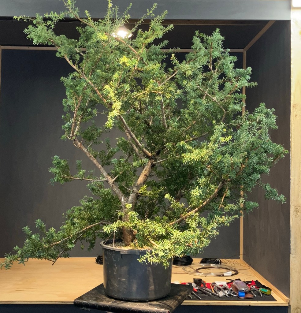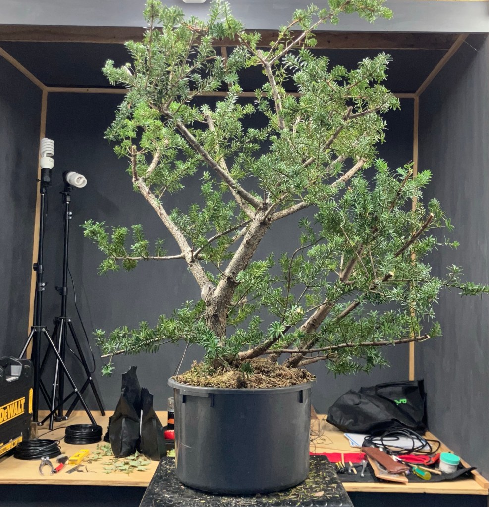 (Mar-24) Al-01/17 – Documenting the removal of this air-layer seemed appropriate. Thanks to my wife for coming out in the rain and taking the picture!The chosen container size, just the right depth and width to accommodate the incoming root ball. A plank of wood to be used to anchor the root ball. Container size is extremely important, so please do not discount this. Further drainage holes were made into the container. (Aug-24) A good amount of roots, but at this stage very easily broken. Decision made to not try and remove the sphagnum moss. A good amount of age already accumulated.The plank of wood screwed into the ‘stalk’ at the base of the tree to anchor and stabilise. This will be cut back to the base of the air-layer at next repotting. The root ball placed in. Galvanised steel wires were used to secure the wood plank to the base of the container. A tricky task to squeeze your hand in there, but well worth it.The potted air-layer! Medium grade pumice was used as the soil medium. I was very aware of the core staying too wet with the sphagnum moss. Subsequently I’ve had to be very accurate with the watering, balancing water and oxygen. Further galvanised steel was used to stabilise the tree to the container. If the tree is moving it’s dieing! That’s a big air-layer!(Dec-24) Fast forward 9 months, late December. This without a doubt proves the strength of these trees is in their vascular system. That was a lot of foliage to leave on and done on purpose. Yes sure, it shed needles along the way but it also put on more growth and didn’t drop any branches. The foliage has done the work and created further roots.Preparation, initial cut backs made, options for future styling left open. The cut back was made in late December (early summer in New Zealand) as these trees are now ready to push another flush of growth and by utilising this growth flush to my advantage it will allow me to style these trees come autumn as the foliage put on will be more usable in the design process.